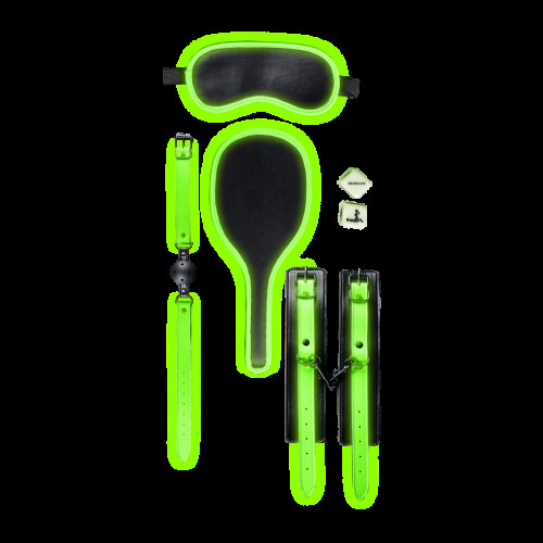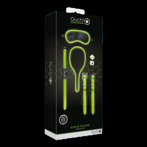 Το κιτ περιέχει: Χειροπέδες, Αναπνεύσιμο Φίμωτρο, Ζάρι, Κουπί και Μάσκα Ματιών. Τα προϊόντα Ouch! Λάμψη στο Σκοτάδι πρέπει να ενεργοποιηθούν με το φως του ήλιου πριν τα απολαύσετε στο σκοτάδι.