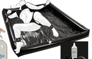 Μαύρο φύλλο βινυλίου Glossy Games από τη συλλογή φετίχ που περιλαμβάνει 4 στηρίγματα και 1 λίτρο λιπαντικό. Το σεντόνι με φουσκωτό περίγραμμα (ύψος 15 cm) εγγυάται τέλεια προστασία σε οποιαδήποτε επιφάνεια (π.χ. κρεβάτι, καναπές, χαλί κ.λπ.) και προσφέρει πολύ χώρο (140 x 185 cm) για επιπλέον υγρή, λιπαρή, αφρώδη, υπέροχα ολισθηρή δέσμευση Παιχνίδια. Διαθέτει 8 συγκολλημένες οπές (2 σε κάθε γωνία) για να στερεώσετε τις συμπεριλαμβανόμενες χειροπέδες και τις μανσέτες στον αστράγαλο μέσω κουμπωτών γάντζων – είναι γρήγορο και εύκολο. Το φύλλο μπορεί επίσης να σκουπιστεί εύκολα, πράγμα που σημαίνει ότι καθαρίζεται και είναι έτοιμο για χρήση σε χρόνο μηδέν.