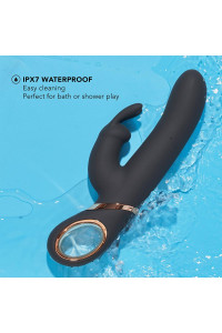 Αυτό το μεγάλο, πανέμορφο κουνέλι είναι τόσο ισχυρό όσο και ευέλικτο! Κατασκευασμένο από μεταξένια, ομαλή πολυτελή σιλικόνη, τα χειριστήριά της προσφέρουν ξεχωριστά κουμπιά για κάθε λειτουργία συμπεριλαμβανομένης της περιστροφής κατεύθυνσης. Περιστρεφόμενες χάντρες στον άξονα εγγυώνται μια ομαλή βόλτα κάθε φορά. Ο διεγέρτης κουνήματος έχει 3 ταχύτητες, 5 λειτουργίες.