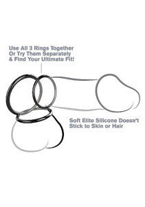 Σετ 3 δακτυλίων διαδοχικών διαμέτρων για το πέος, τους όρχεις και τη βάση του πέους. Κάντε το δικό σας συνδυασμό και δώστε όχι μόνο απόδοση αλλά και δυναμικό λουκ στο κρεβάτι! Από μαλακή και εύκαμπτη σιλικόνη. Διάμετροι: 5, 4 & 3,1εκ.