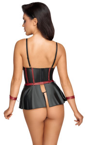 Στράπλες κορμάκι από κορδόνι χωρίς καβάλο από την Cottelli BONDAGE σε ευγενή μαύρο ματ εμφάνιση. Έρχεται με αποσπώμενη ζώνη σε κόκκινη ματ εμφάνιση με μεταλλικά αξεσουάρ σε ασημί χρώμα. Οι αλυσίδες κουμπώματος με γάντζο είναι αποσπώμενες από τη ζώνη, έτσι ώστε ο γιακάς, η ζώνη μέσης και οι χειροπέδες να μπορούν επίσης να φορεθούν μόνα τους. Ο γιακάς και η ζώνη μέσης είναι ρυθμιζόμενα με καρφιά πρέσας, οι μανσέτες από σύρμα με κουμπώματα με γάντζο και βρόχο. Μια διεγερτική αλυσίδα περνά μέσα από τον εντελώς ανοιχτό καβάλο, ο οποίος μπορεί επίσης να αφαιρεθεί.